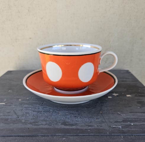 Puodelis su baltais „žirneliais” ir lėkštute