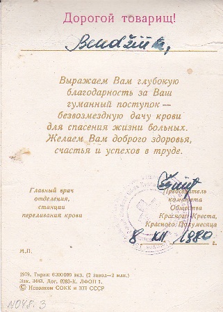 Atvirukas donorui „Благодарность донору”, 1980