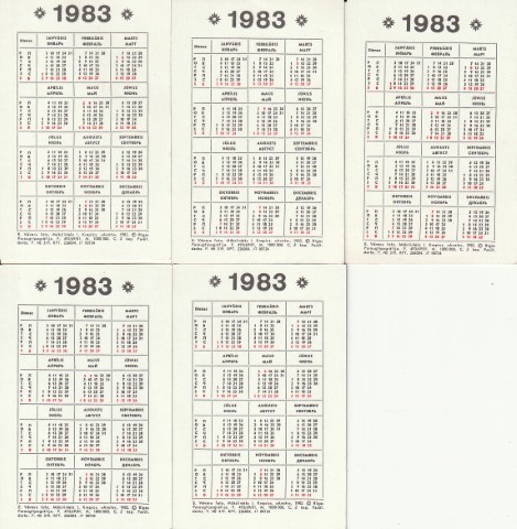 Kalendoriukų rinkinys, 1983, 5 vnt.