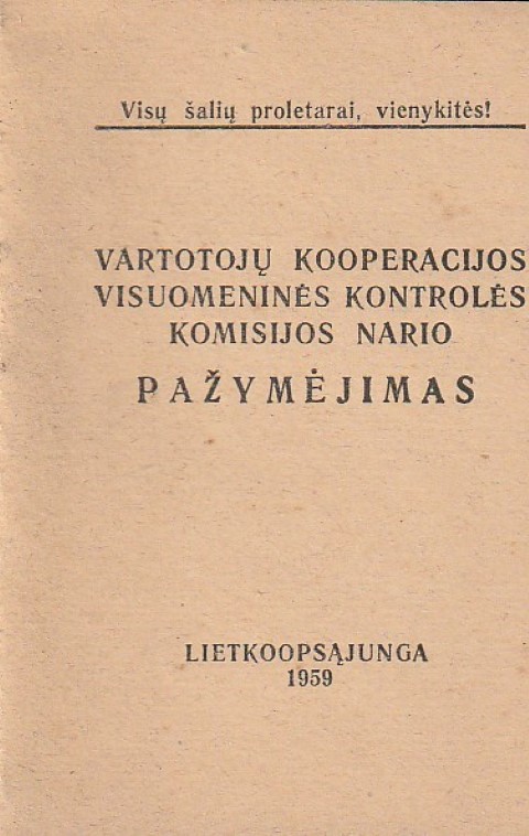 Vartotojų kooperacijos visuomeninės kontrolės komisijos nario pažymėjimas, 1959
