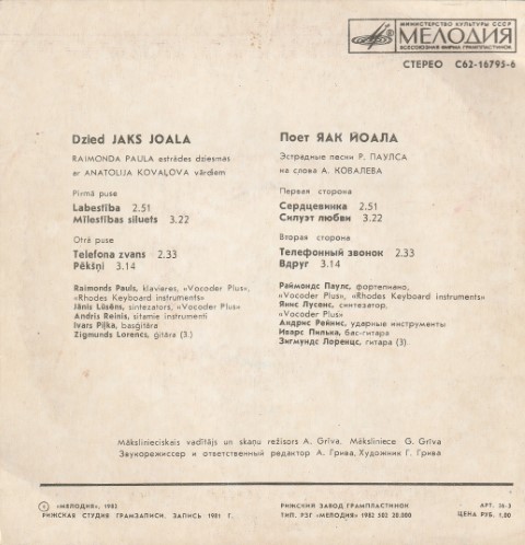 Plokštelė „Dainuoja Jaks Joala”, 1982